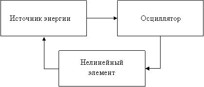 Схематично автоколебательную систему можно представить в виде источника энергии, осциллятора с затуханием и обратной связи (нелинейного элемента) (рис. 1).