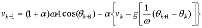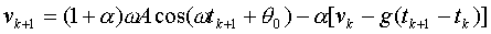 замечая, что скорость поверхности является производной по времени высоты поверхности, , и что между столкновениями мячик двигается с ускорением свободного падения, поэтому его скорость определяется как vk – g(t – tk).